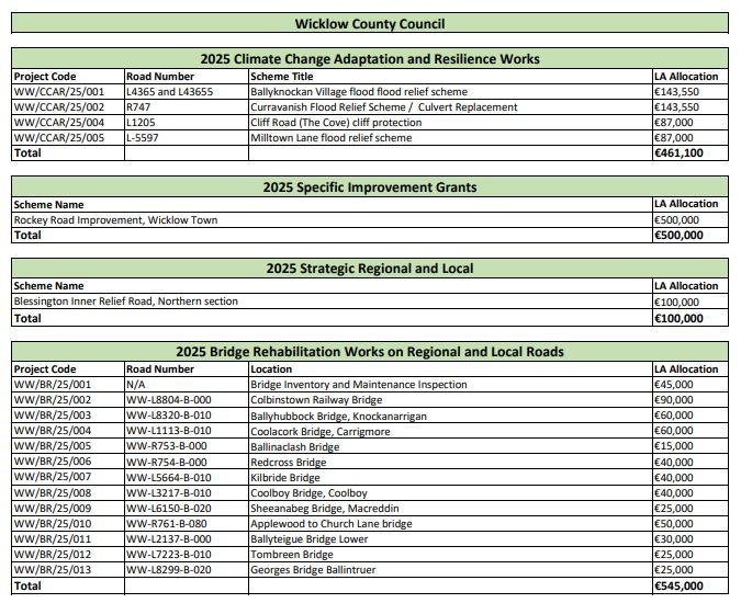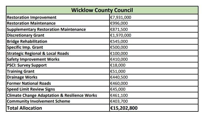 Wicklow County Council has announced that the Department of Transport has allocated €15.2 million for various maintenance and Wicklow Roads improvement projects across the County, focusing on regional and local roads.